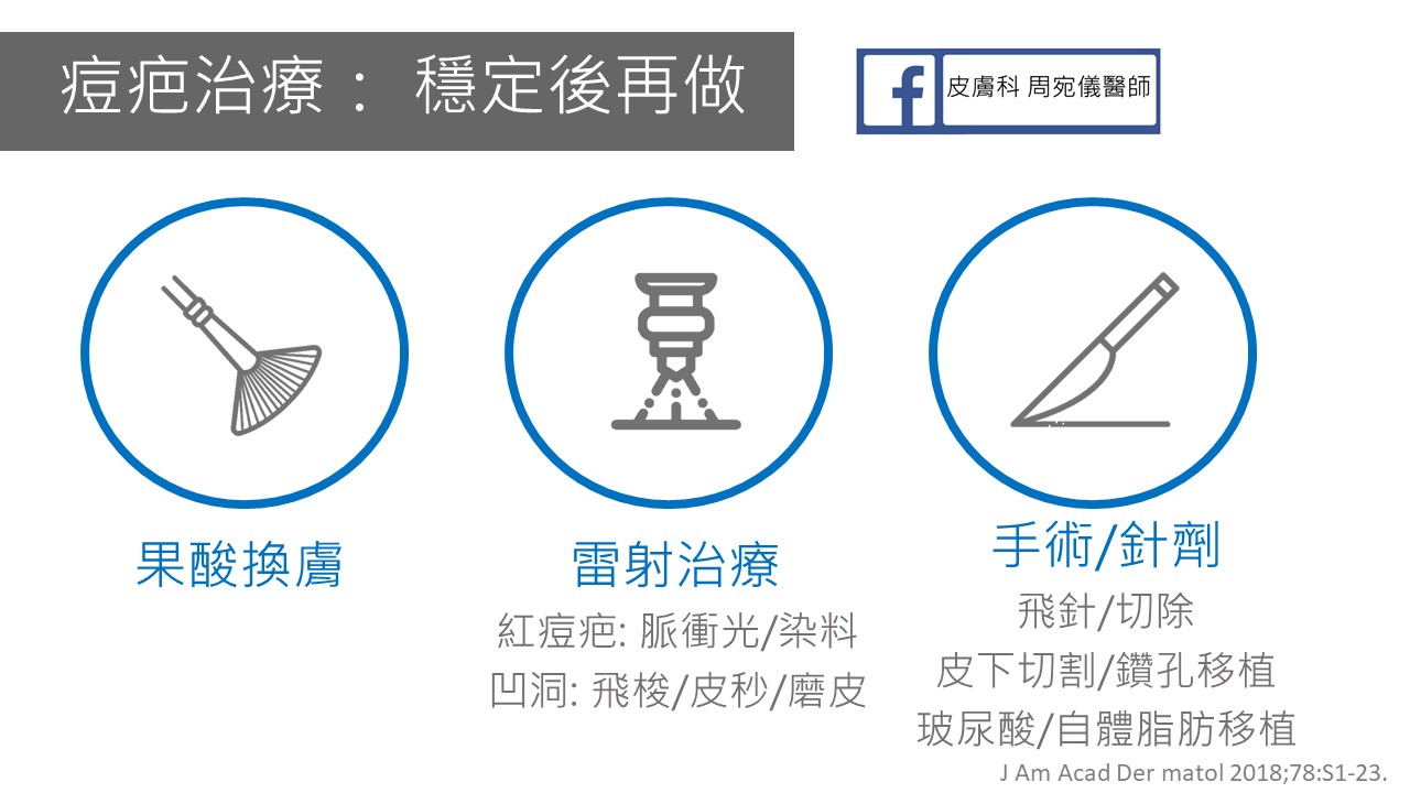 痘疤到底何時才能治療呢?等穩定後再做是最合適的,否則一邊長痘痘、一邊處理痘疤只是浪費錢而已。依據不同類型的痘疤,也有不同的治療方式。